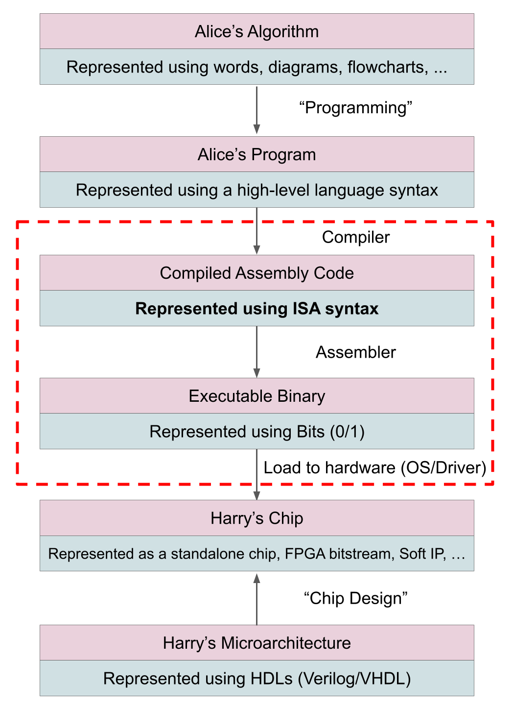 The mapping between Alice’s algorithm and Harry’s hardware using a standard ISA can be understood using this diagram: