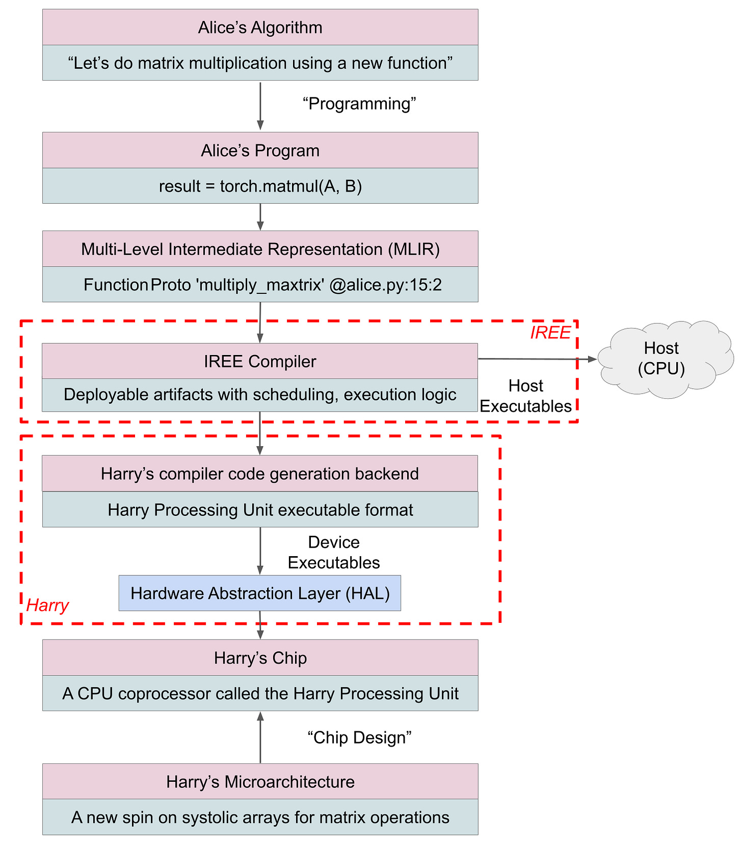 In the second approach, the bridge moves deeper into the stack. Instead of plugging into a runtime API, Harry integrates at the compiler level, where programs are transformed before execution. Alice still writes high-level code, but now the compiler is responsible for mapping that computation onto the hardware - deciding how loops are formed, how memory is reused, and how execution flows on the device.