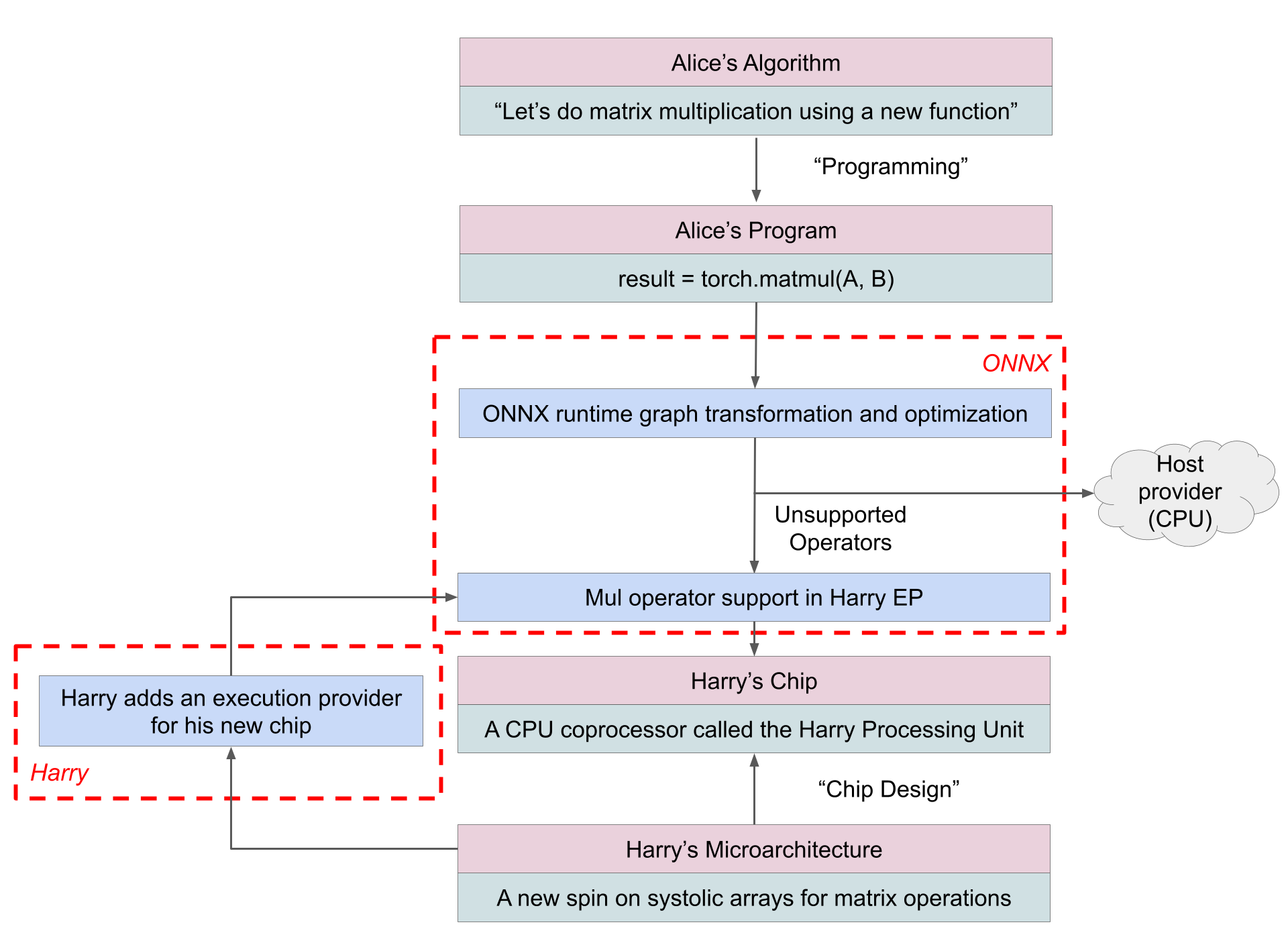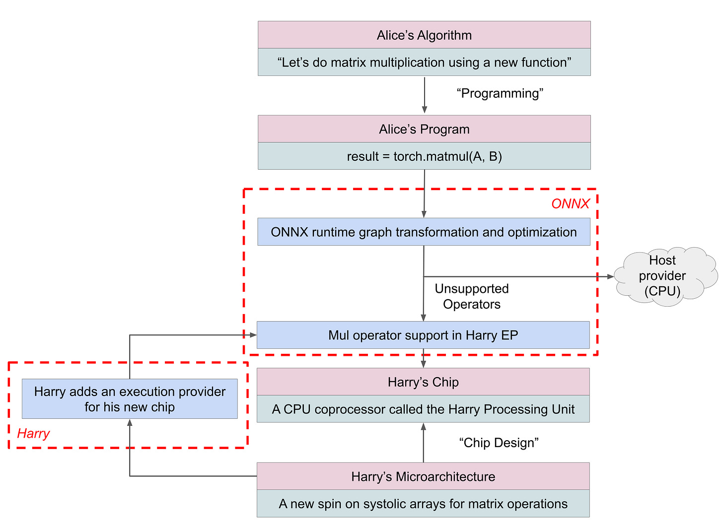 A concrete example of this approach is ONNX Runtime Execution Providers, where hardware vendors accelerate supported operators while delegating unsupported parts of the model to a fallback device. This diagram explains how Alice’s software and Harry’s hardware can talk to each other using ONNX.