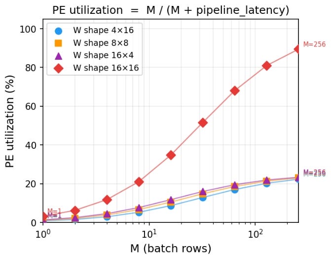 The 16×16 case asymptotically approaches 100% utilization, as the pipeline overhead becomes negligible compared to useful work.
