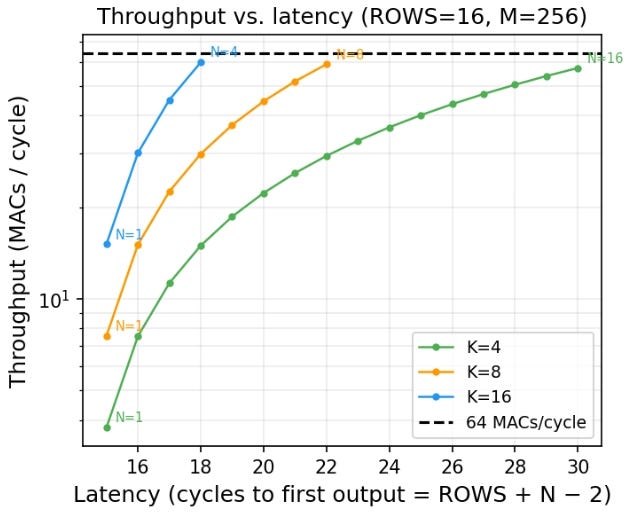 This throughput-latency tradeoffs starts to become even more interesting in accelerator designs with pipelined PEs to achieve higher clock frequencies, and full-system implementations with non-zero instruction and memory latencies - topics we will explore in future posts.