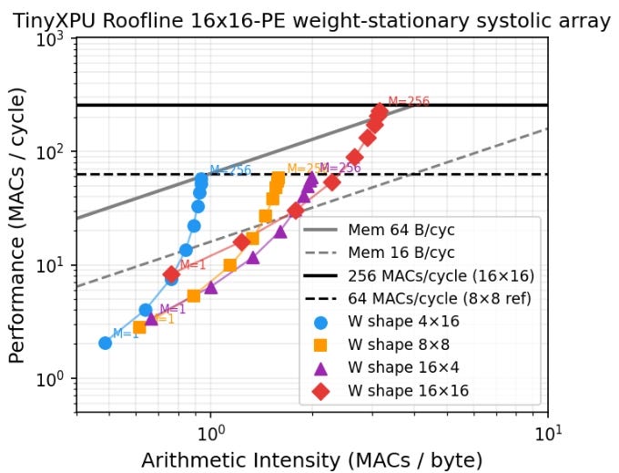 For our 16×16 array, this gives a peak of 256 MACs per cycle. However, if the weight matrix is smaller than the array, only K×N PEs perform useful work. This represents the vertical axis of our roofline model.